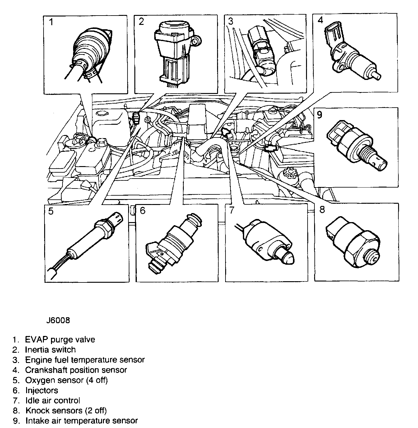 The knock sensor produces an output voltage in proportion to mechanical vibration caused by the engine. A sensor is located in each cylinder bank between 2/4 and 3/5 cylinders. The ECM calculates if the engine is knocking due to camshaft and crankshaft sensor signals regarding the position of the engine in the cycle. The ECM can also work out exactly which cylinder is knocking and retards the ignition on that particular cylinder until the knock disappears. It then advances the ignition to find the optimum ignition timing for that cylinder. The ECM can adjust the timing of each cylinder for knock simultaneously. It is possible that all eight cylinders could have different advance angles at the same time. If the camshaft sensor fails, the knock sensor will continue to work, but as the engine may be running one revolution out of sychronisation the ECM may retard the wrong cylinder of the pair e.g. 1 instead of 6. If the knock sensor fails engine knock will not be detected and corrected. The fault is indicated by illumination of the malfunction indicator light (MIL) on North American specification vehicles.