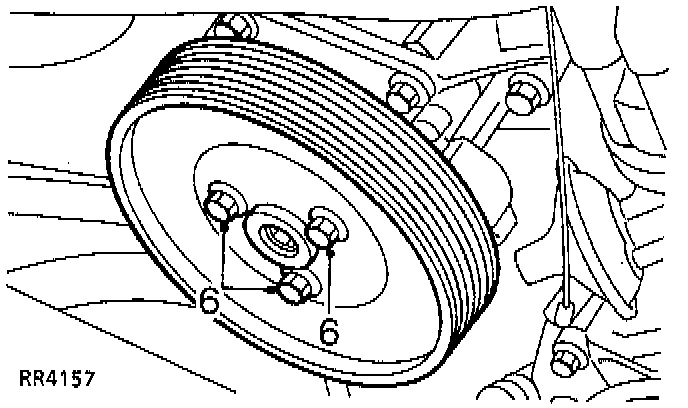 6. Using a suitable 9 mm Allen wrench to counterhold steering pump pulley, remove the 3 bolts (6) securing pulley to pump, then remove pulley.