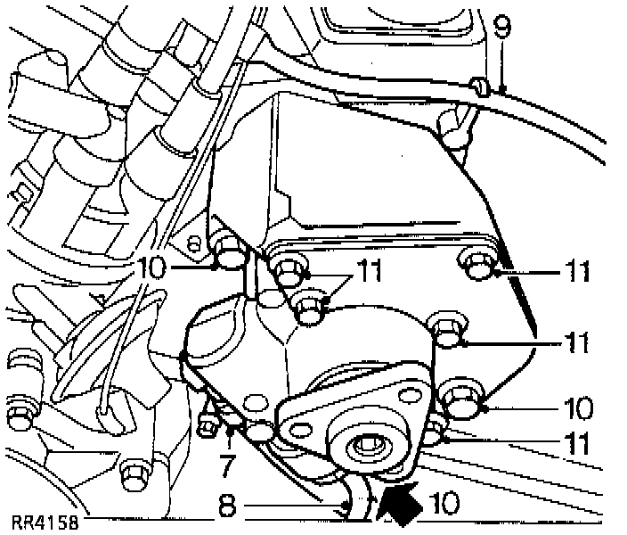 10. Remove the 3 bolts (10) securing steering pump, then remove pump and recover engine lifting bracket.
