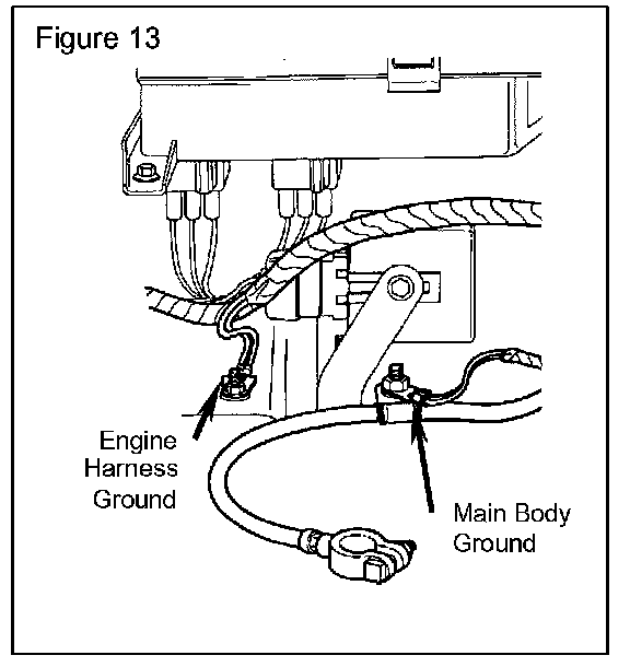 1. Refer to Figure 12. Remove ground cable and clean the main engine ground cable eyelets at the engine block ensuring they are free from contaminants.