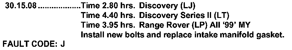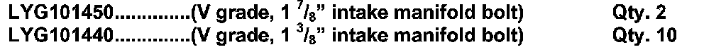 Stronger intake manifold bolts (LYG101450, LYG101440) have been introduced. The new bolts can be identified by the letter 'V" stamped on the bolt head. Using new-specification unstretched bolts permits tightening to the correct torque and will provide a proper repair.