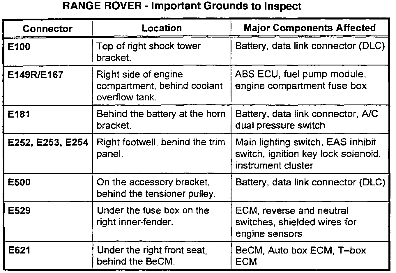 Refer to the illustrated charts for important ground locations to be checked.