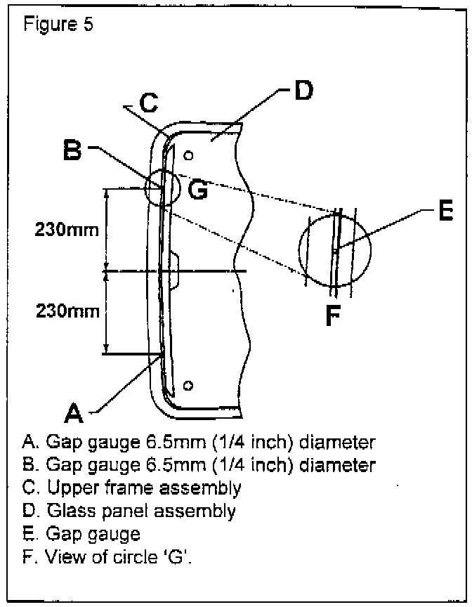 7. Turn sunroof assembly over and place two 6.5 mm (1/4 inch) spacers between front edge of the glass and the upper frame assembly, approximately 230 mm (9 inches) from either side of the centerline of the glass (Figure 5 positions A and B).