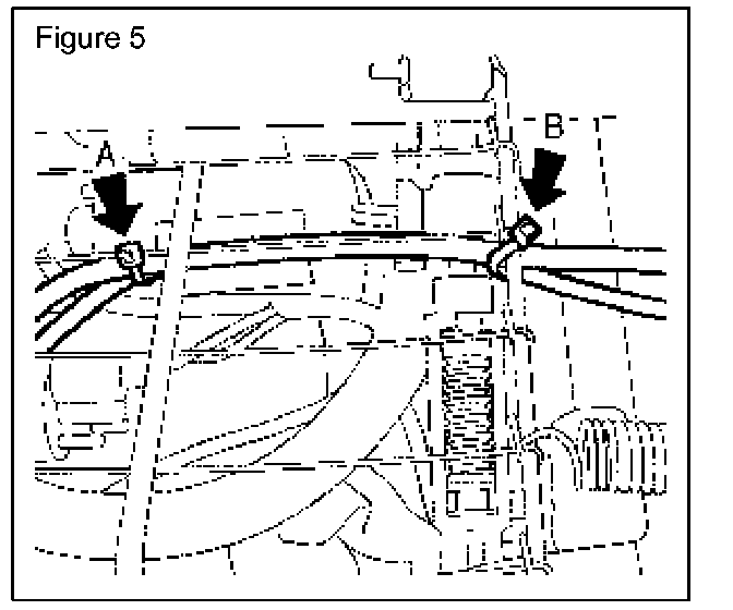 Tie wraps must be installed in both locations "A" and "B" as depicted in Figure 5 for proper location and protections of the seatbelt pre-tensioner harness.