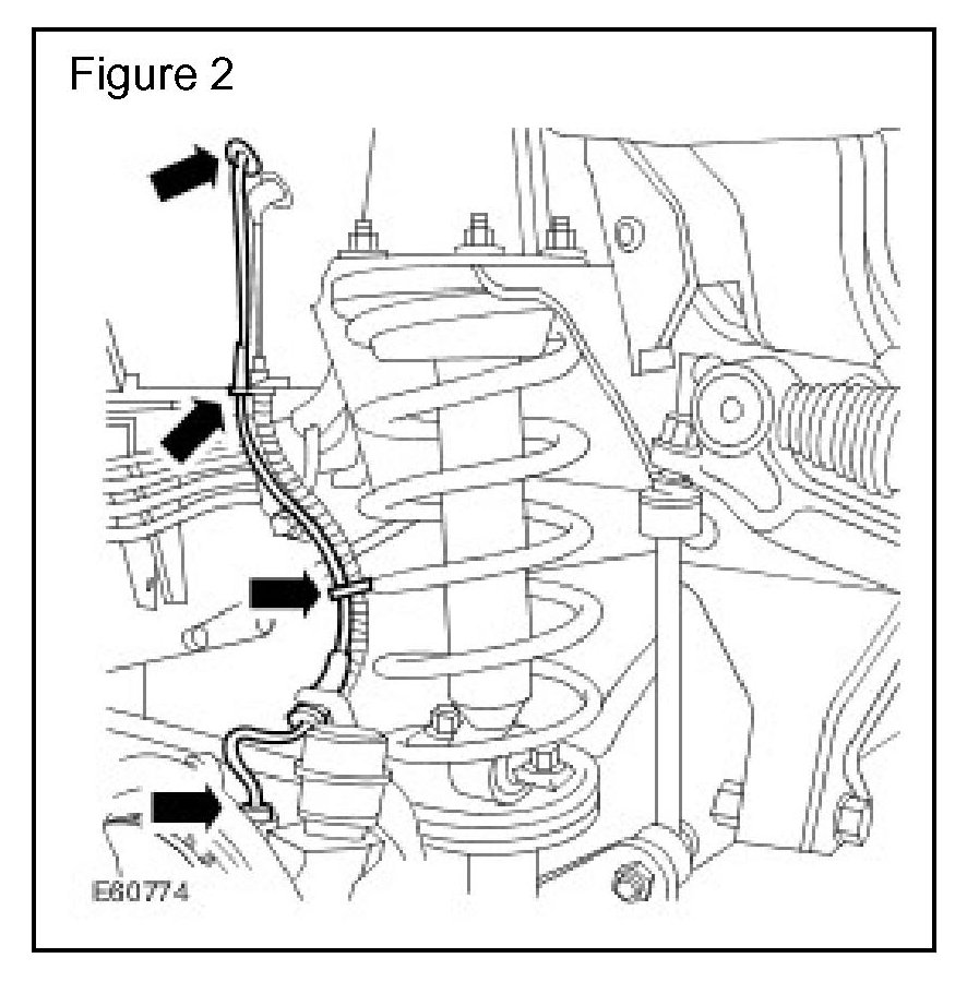 6. Release the harness from the brackets on the inner fender valance, suspension turret and front hub. (Figure 2)