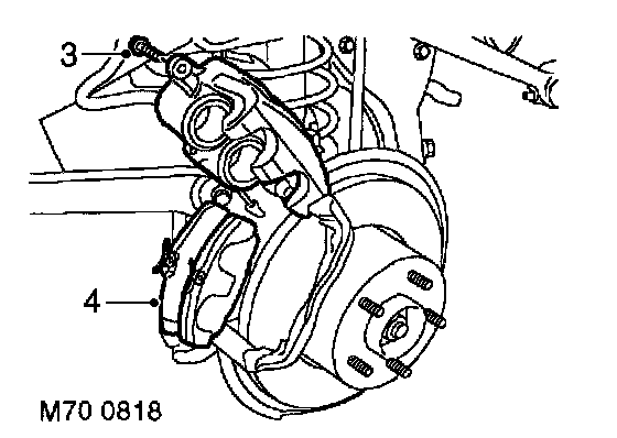 3. Remove lower guide pin bolt from caliper and pivot caliper housing upwards.