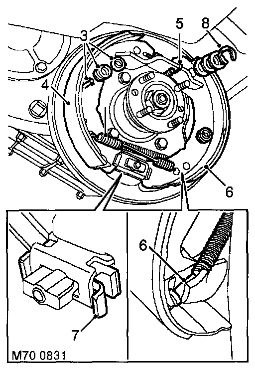 3. Remove 2 washers, springs and pins retaining brake shoes to back plate.