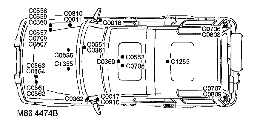 The following illustration indicates the general position of each earth point and earth header on the vehicle.