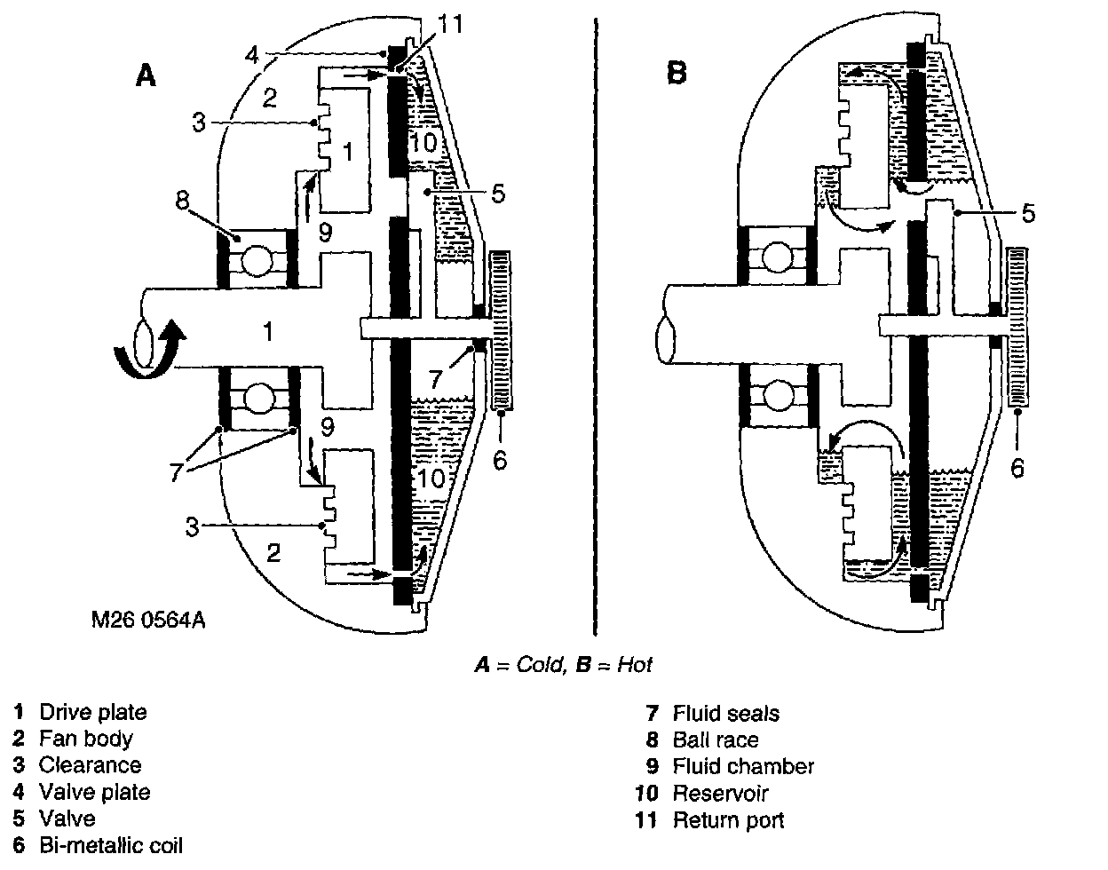 When the coolant temperature is low, the heat emitted from the radiator does not effect the bi-metallic coil. The valve remains closed, preventing fluid escaping from the reservoir into the fluid chamber. In this condition the fan will 'freewheel' at low speed.