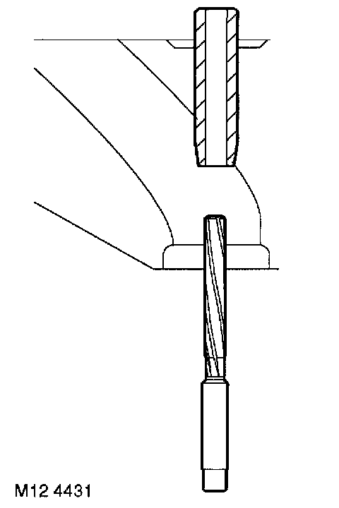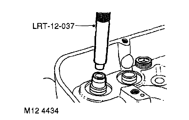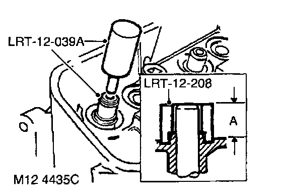 20. Lubricate new valve guide with engine oil and partially fit to cylinder head, from valve spring side of head, using tool LRT-12-039A. Service valve guides are 0.025 mm (0.001 in) oversize on outside diameter to ensure an interference fit.