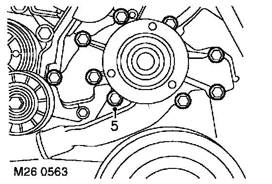 5. Remove 9 bolts securing coolant pump, remove pump and discard gasket.