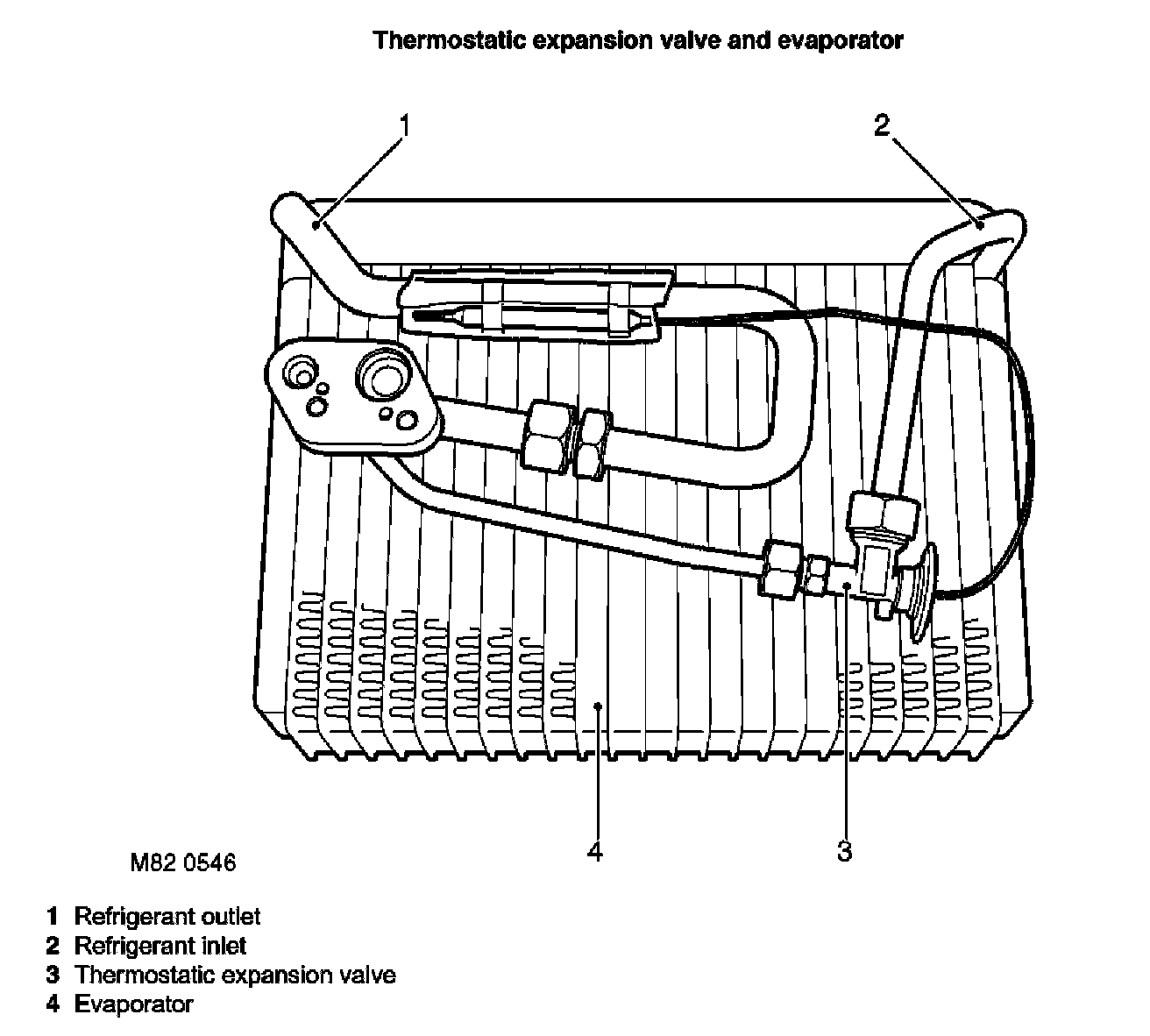 The thermostatic expansion valve is installed in the heater assembly, in the refrigerant inlet line to the evaporator. Liquid refrigerant flows through the valve to the evaporator. The restriction across the valve reduces the pressure and temperature of the refrigerant and changes it to a fine spray, which improves the evaporation process. Valve opening is controlled by the pressure in a capillary tube containing a temperature sensitive fluid. One end of the capillary tube is connected to a diaphragm housing on the thermostatic expansion valve, the other end of the capillary tube is sealed and attached to the refrigerant outlet line of the evaporator. As the temperature of the refrigerant leaving the evaporator changes, a corresponding change of capillary tube pressure and valve opening are produced. The warmer the refrigerant leaving the evaporator becomes, the greater the volume of refrigerant allowed through the valve.