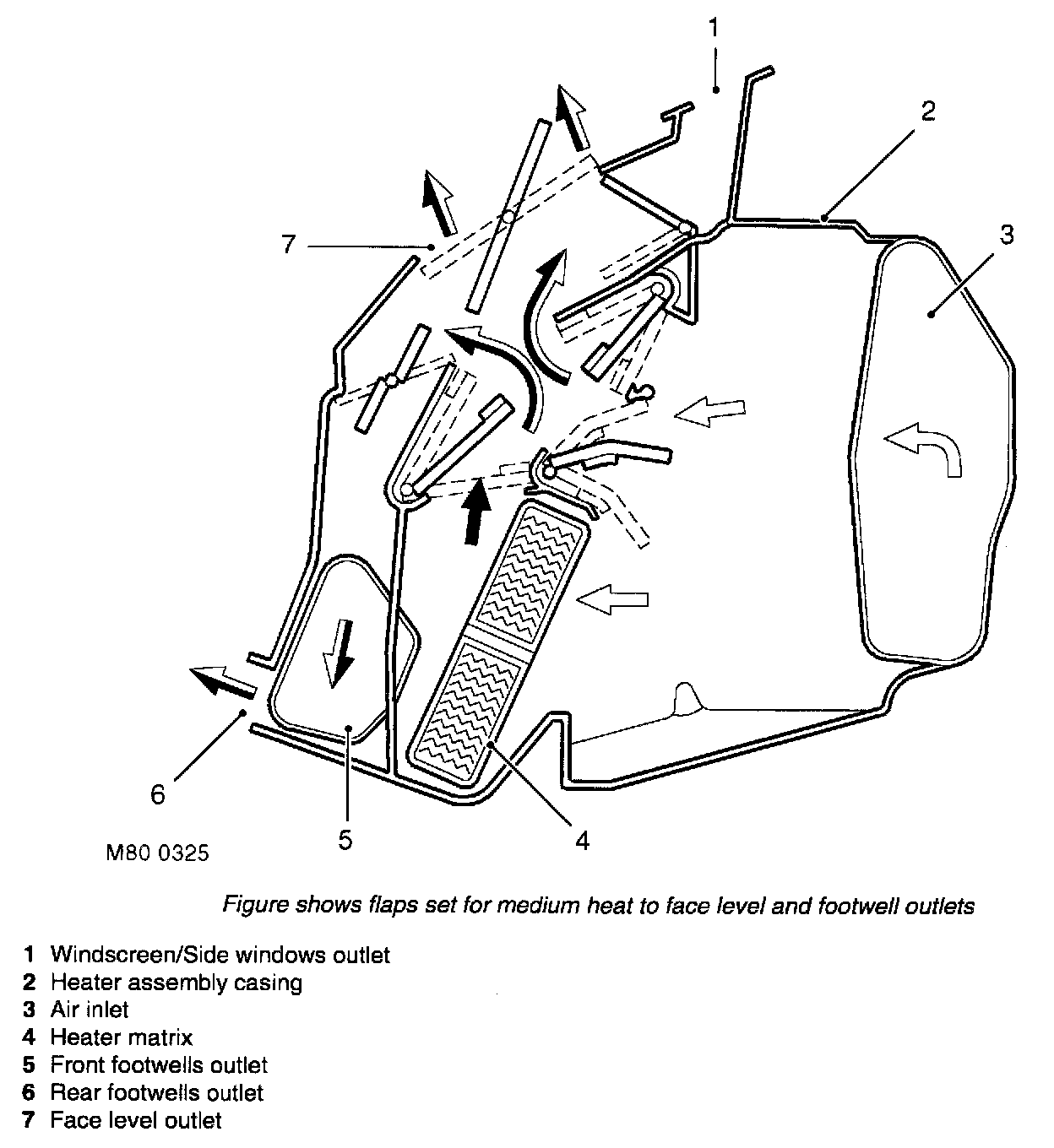 Blend flaps:Two sets of three blend flaps, one LH and one RH, regulate the flow of air through the heater matrix and a heater matrix bypass, to control the temperature of the air leaving the heater assembly. The two sets of blend flaps operate independently to allow different temperatures to be set for the LH and RH outlets.