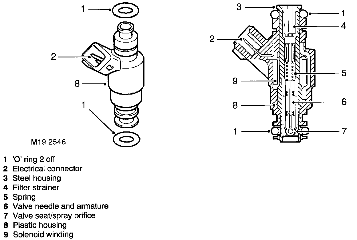 Each injector receives a battery supply voltage via a fuse in the engine compartment fusebox. The fuel delivery timing is controlled by the ECM, which, at a precisely timed interval, provides a ground path for the injector. The completion of the ground path operates the injector to allow fuel at pump pressure to be delivered from the fuel rail to the injector nozzle. Each injector sprays a finely atomized spray of fuel into the inlet, where it is mixed with the intake air prior to combustion.