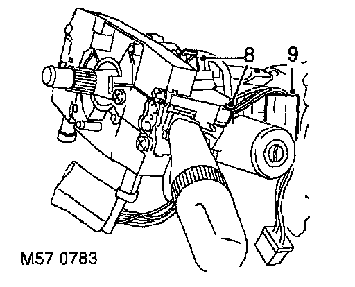 12. Remove 4 nuts securing steering column assembly to fascia rail and remove steering column assembly.