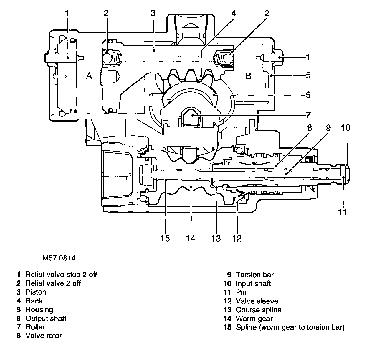 Movement of the input shaft is transferred through the pin to the torsion bar and valve rotor on the input shaft. As the input shaft turns, the spline of the torsion bar turns the worm gear. This action causes the roller to rotate on its bearings and move. As the roller is located by a pin to a yoke on the output shaft, the output shaft rotates in the steering box housing. As the amount of torque acting on the input shaft increases the torsion bar starts to twist. As the torsion bar twists the valve rotor turns in the valve sleeve. When the ports in the valve rotor and valve sleeve are turned, hydraulic fluid is directed to chamber 'A' or 'B' in the power cylinder.