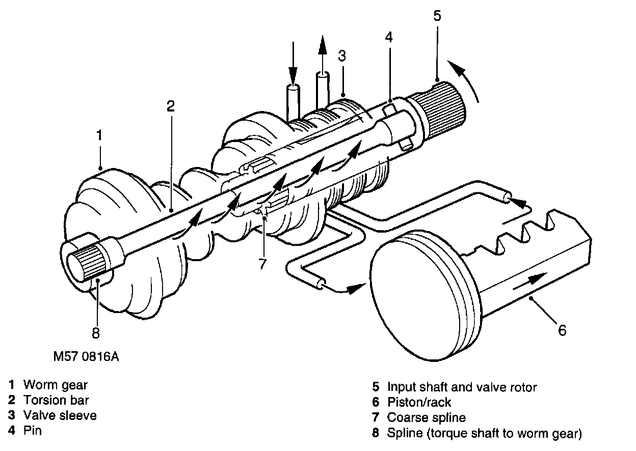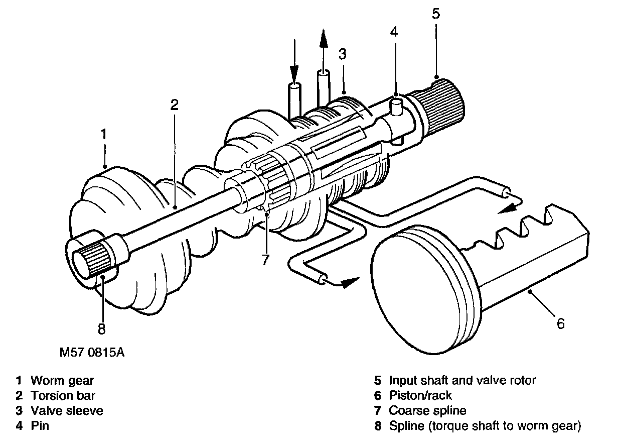 With hydraulic fluid in one chamber under high pressure, the piston moves. The return line ports in the rotary valve, aligned by the movement of the valve rotor, allow the fluid in the opposite chamber to flow to return. The teeth of the rack move and transfer the force from the piston to the output shaft, giving assistance to move the drop arm. As the output shaft rotates the torsion bar load is decreased. The rotor on the input shaft will return as the torsion bar unwinds, the rotary valve will then be in a neutral position and the pressure in chambers 'A' and 'B' will equalize. With no high pressure acting on the piston, force on the piston and rack is released.