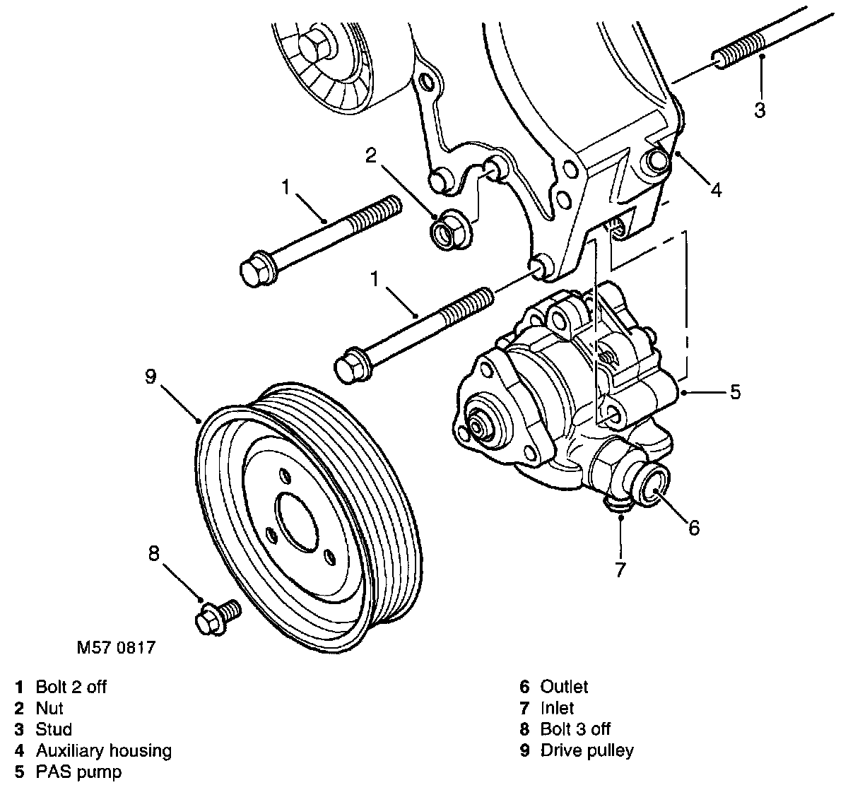 The PAS pump is located on the auxiliary housing and is attached by two bolts, the bolts go through flanged bushes in the auxiliary housing. A stud passes through the PAS pump and through a flanged bush in the auxiliary housing, the auxiliary housing and PAS pump are secured by a nut. As the two bolts and nut are tightened the bushes move slightly and the flange of each bush clamps the PAS pump. A drive pulley is attached to the pump drive shaft with three bolts, and is belt driven at a ratio of 1.4 crankshaft revolutions to 1 of the drive pulley. Fluid is drawn into the PAS pump inlet from the reservoir through a flexible hose at low (suction) pressure. Fluid at high pressure from the PAS pump outlet is supplied to the rotary control valve on the steering box.