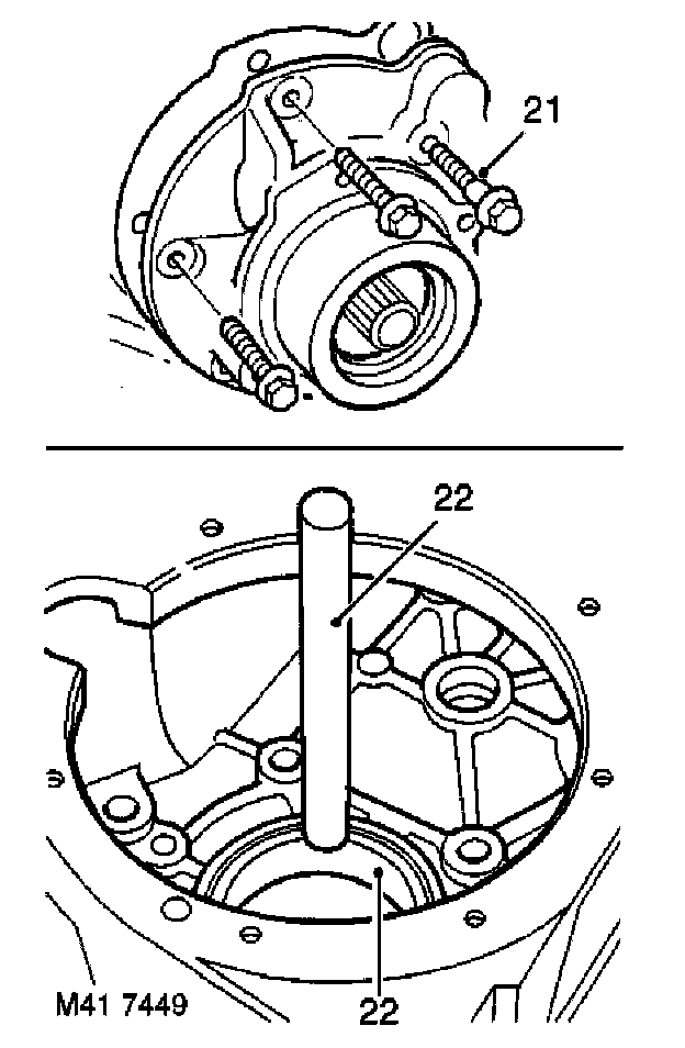 3. Note position of longest bolt and remove 8 bolts securing front output shaft housing to main casing and remove housing.