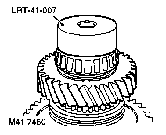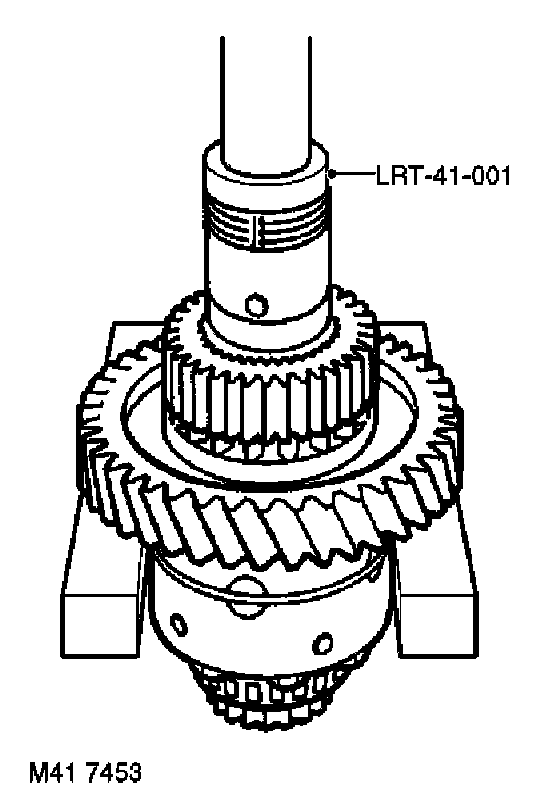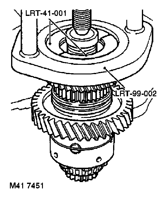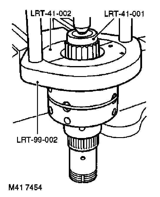 31. Position tool LRT-41-002 around front differential bearing and tool LRT-41-001 thrust button to differential shaft and press off bearing.