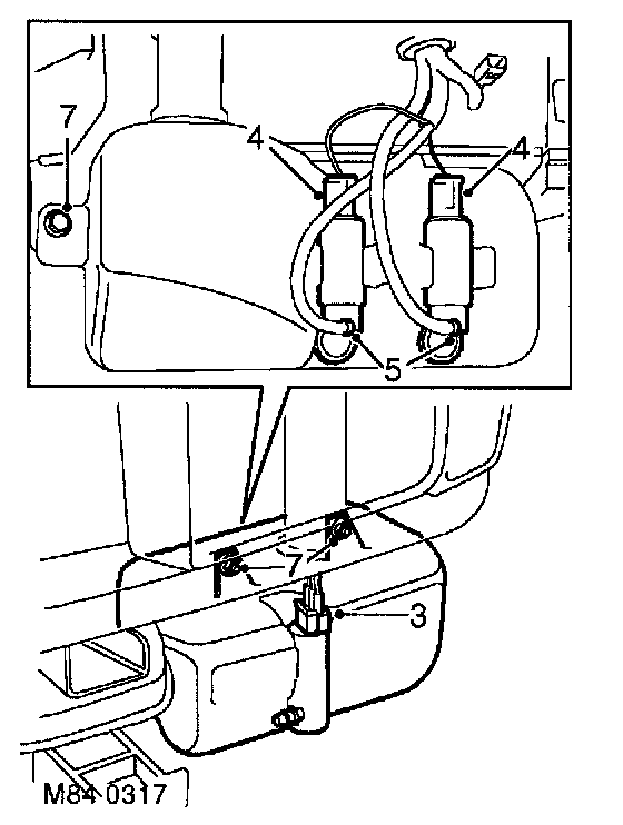 5. Connect hoses to rear screen pump, windscreen washer pump and headlamp washer pump. Secure hoses with clips.