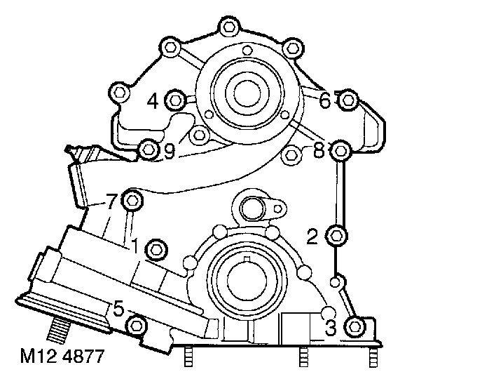 20. Fit front cover to cylinder block and tighten bolts in sequence shown to 22 Nm (16 ft. lbs.). Ensure CMP sensor multiplug bracket is secured by bolt