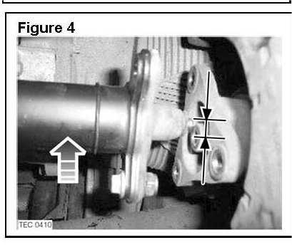11. If the measured distances are equal both above and below the locating bushing (Figures 3 & 4), the differential is correctly aligned to the transfer box front output flange. Go to section Install Front Propeller Shaft".