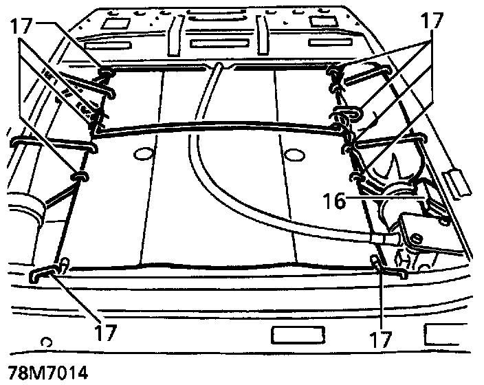 19. Note position of 4 hog rings securing squab cover retention wire to front of bladder frame. Remove hog rings.
