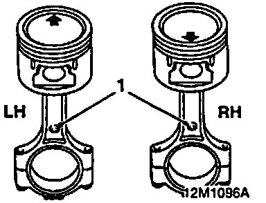 1. Assemble pistons to connecting rods with arrow on piston pointing towards domed shaped boss on connecting rod for RH bank of cylinders, and arrow pointing away from dome shaped boss for LH bank of cylinders.