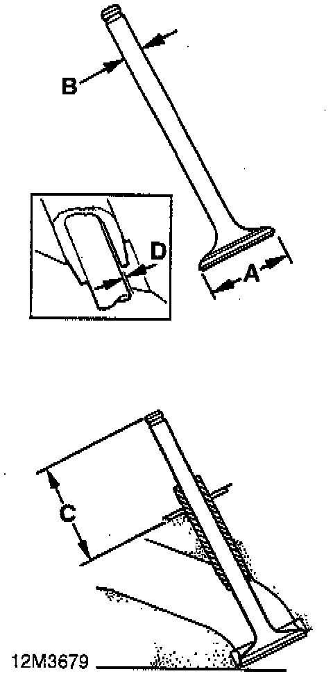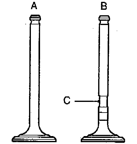 Valve, Valve Spring and Valve Guide InspectionNOTE: Two types of exhaust valve may be installed-standard valves A in illustration or carbon break valves-B in illustration. Carbon break valves may be identified by the machined profile C on the valve stem. To prevent exhaust valves *ticking, standard exhaust valves should be replaced with carbon break valves during engine overhaul.