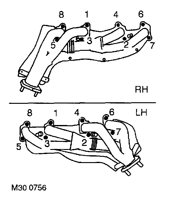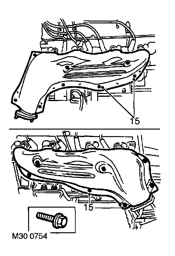 15. Remove 8 (RH exhaust manifold) or 7 (LH exhaust manifold) bolts securing outer heat shield to manifold. Remove heat shield.