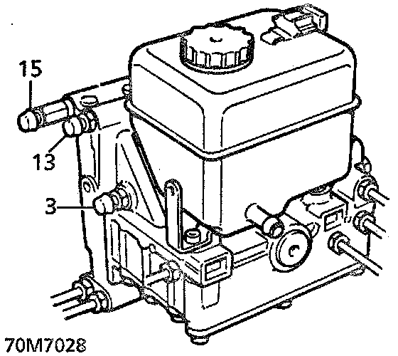 13. Bleed two booster bleed screws (13 and 15), starting at the front bleed screw (13), as follows: Open bleed screw, depress brake pedal, switch ignition on.