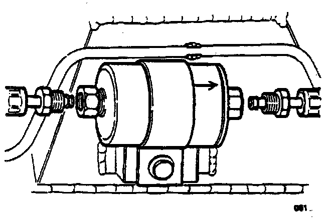 The fuel filter on Land Rover vehicles is mounted on the chassis, near the passenger-side rear wheel arch. An arrow on the filter body indicates the direction of fuel flow.