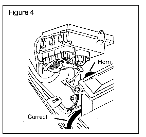 ^ Position the engine harness between the battery box and the alarm horn. (Figure 4 and Figure 5)