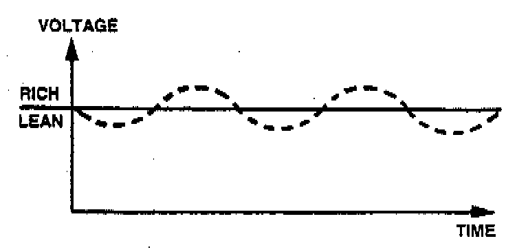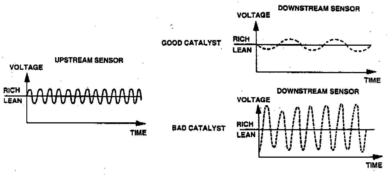 A frequency approaching that of the upstream sensor would indicate that the TWC is not storing oxygen during lean operation. This lack of stored oxygen renders the TWC incapable of burning off excess hydrocarbons produced during the rich cycle. The result is excessive hydrocarbon emissions.