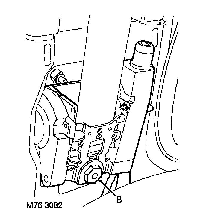 8. Remove bolt securing belt reel to 'B' post. Remove reel.