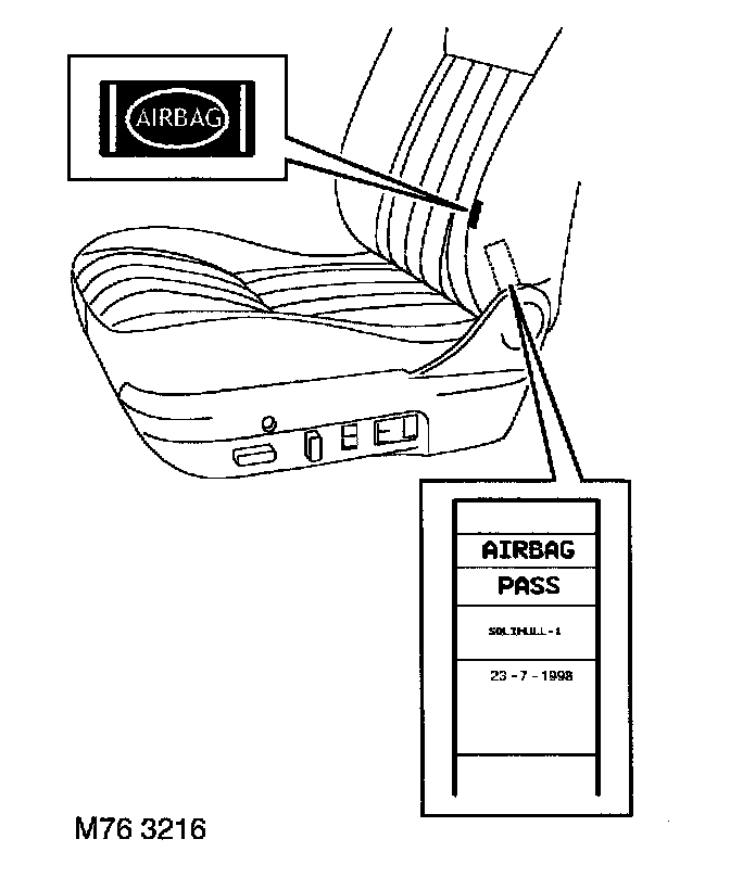 Warning symbols are displayed at various positions in the vehicle (in a suitable prominent position such as bonnet locking platform, centre fascia, sunvisor or etched onto the driver and passenger side glass), the front seats have a warning tag sewed to the beading of the seat trim to indicate the presence of the side airbag modules. SRS components have additional warnings displayed on them to indicate that particular care is needed when handling them. These include airbag modules, DCU, seat belts and rotary coupler.