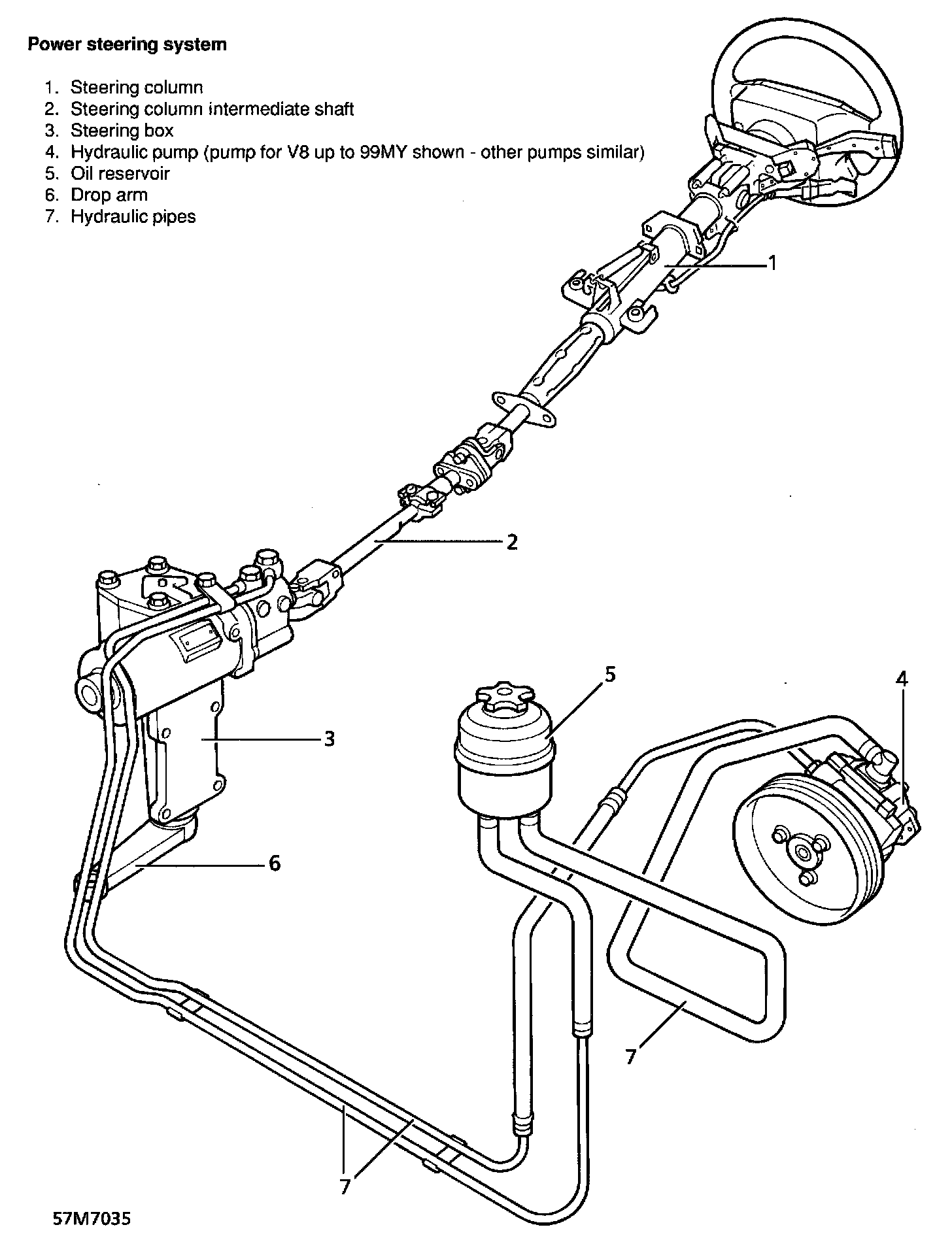 The power steering system consists of a hydraulic pump, a power steering box and a fluid reservoir. The fluid reservoir supplies fluid to the hydraulic pump. This vane type pump is belt driven from the front of the engine. Pressurized fluid flows via a pressure and flow limiting valve to the power steering box. In the steering box, valve spools operated by movement of the steering wheel direct fluid pressure to the appropriate side of the piston to provide power assistance.