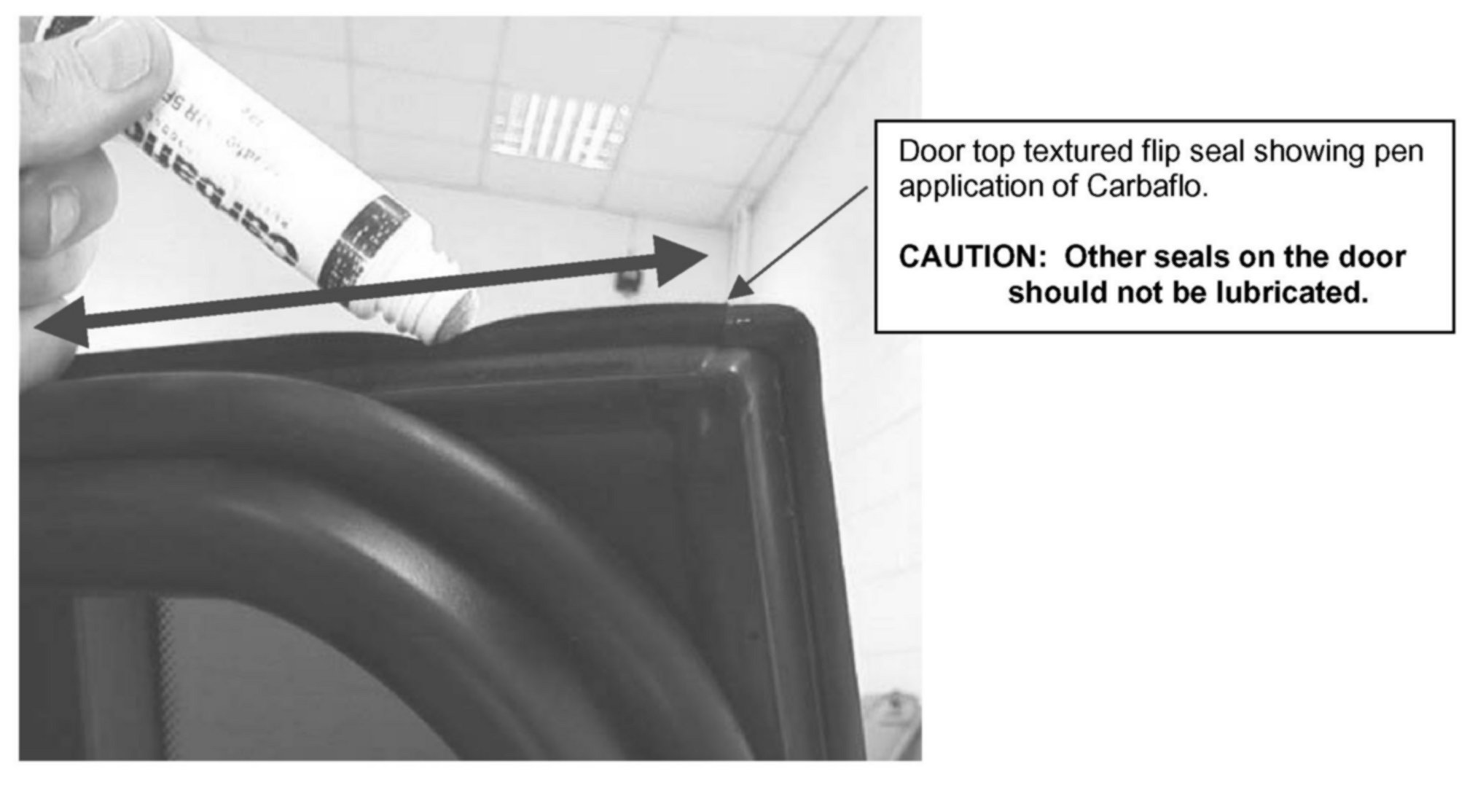 That same flip seal should also be lubricated at each PDI and each Scheduled Maintenance Service as a preventative measure. The requirement to apply a silicon spray lubricant on door flip seals has been replaced by the use of Carbaflo. All Maintenance and PDI Schedules relating to Range Rover (LM) have been updated on InfoTrail to reflect the use of the newly introduced lubricant. Changes to PDI and Complimentary Scheduled Maintenance Program reimbursement are being made to compensate for the cost of this special lubricant application.