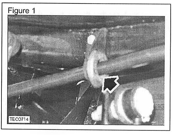 4. Apply Krytox spray (LRN100050S) around the interface of the handbrake cable and grommet. (Arrowed in Figure 1)