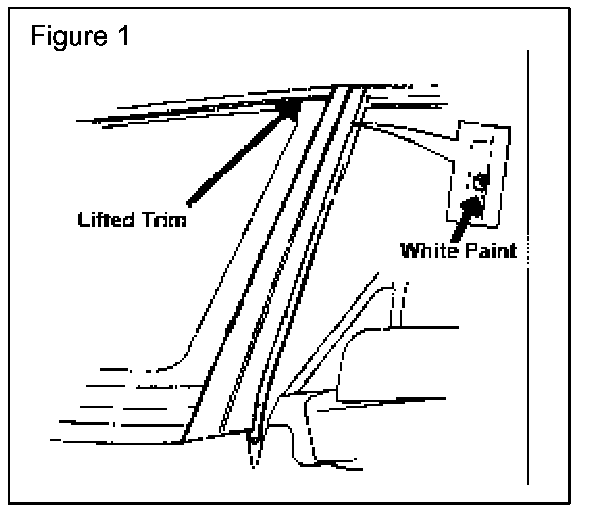 If a dab of white paint is found on the upper retaining screw of the driver's side exterior A-pillar trim, this repair has already been performed. (Figure 1)