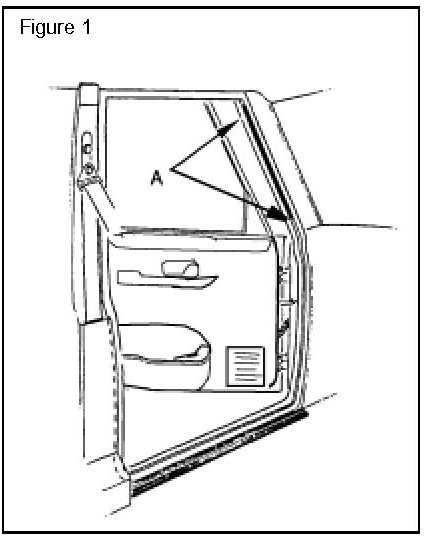 2. Open the door from which the noise is originating and spread the outer "A" pillar/roof seal strip to expose the door opening surfaces behind the "U" flap. (Figure 1, A)
