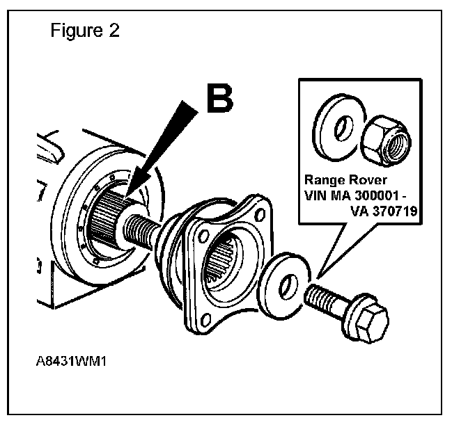 Range Rover vehicles up to VIN VA370719 have pinion flanges secured with a nut. Later vehicles use a flange bolt, (refer to Figure 2). It is essential that each fastener type be tightened to the correct torque as specified below.