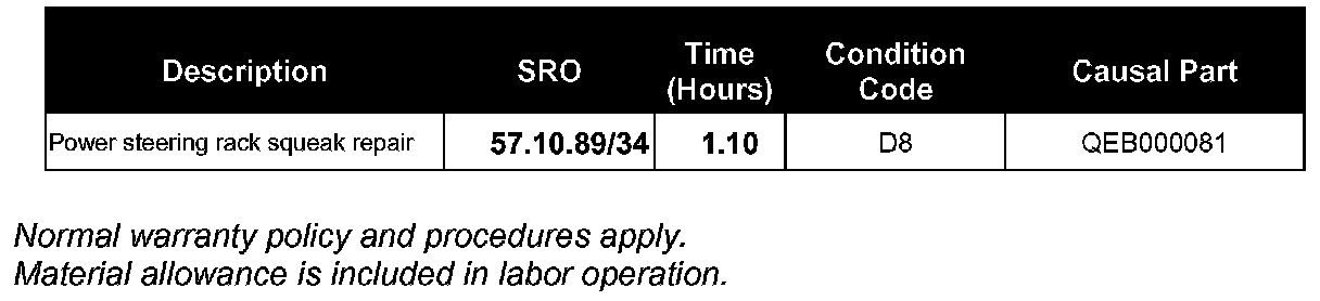 If a customer expresses concern about the squeaking noise, refer to the Service Procedure detailed in this bulletin. The likely cause is steering rack pinion seal squeaking against the pinion.