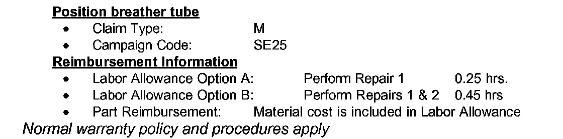 REPAIR 1: POSITION BREATHER TUBE - VEHICLES UNDER 500 MILES IN RETAILER INVENTORY
