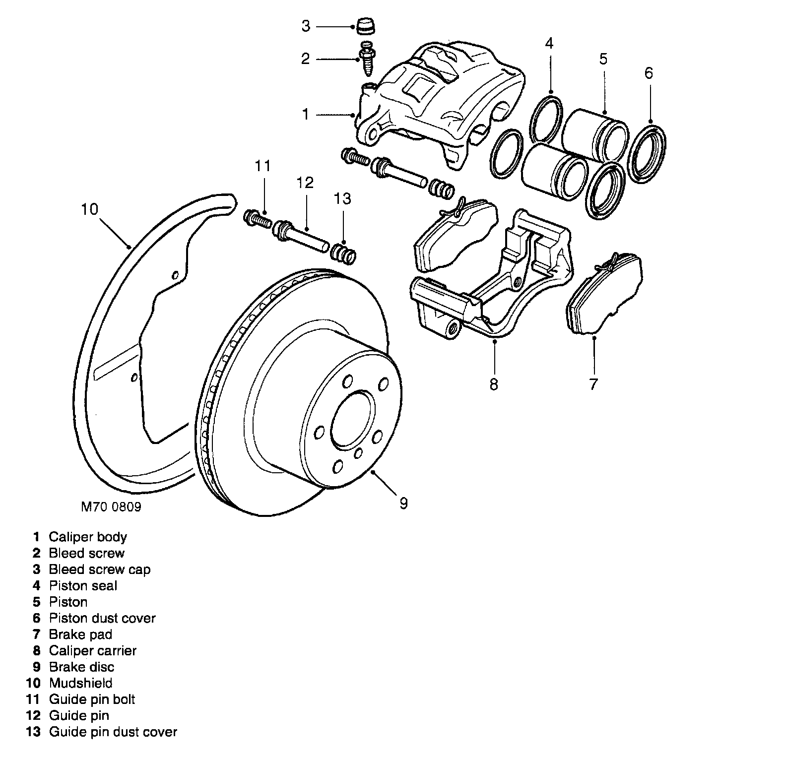 The front brakes each comprise of a hub mounted, twin piston caliper assembly and a ventilated disc. The inboard side of the disc is protected by a mudshield.