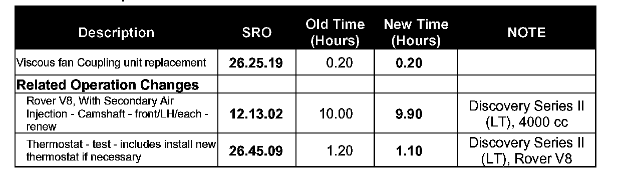 Methods engineers at Land Rover have recently studied the service process for replacement of the viscous fan assembly for Discovery Series II models. Some time efficiencies for gasoline powered vehicles have been obtain, although the study was primarily directed toward diesel powered Discovery vehicles. The step for removal of the acoustic cover has been deleted.