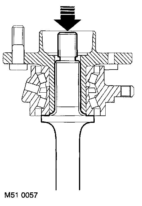 11. Position the wheel hub and drive shaft on a press, place supports beneath the wheel studs and press the drive shaft from the wheel hub.