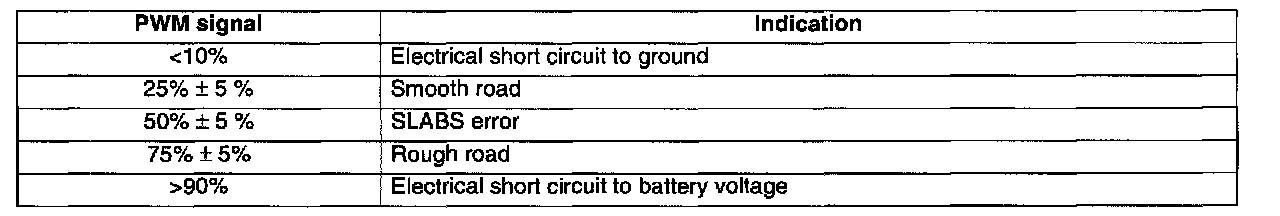 Input for the rough road signal is measured via pin 34 of connector C0637 of the ECM. The SLABS ECU generates a PWM signal that varies in accordance with changing road conditions. The rough road PWM signal operates at a frequency of 2.33 Hz ± 10%. The significance of changes in the PWM signal are shown in the following table: