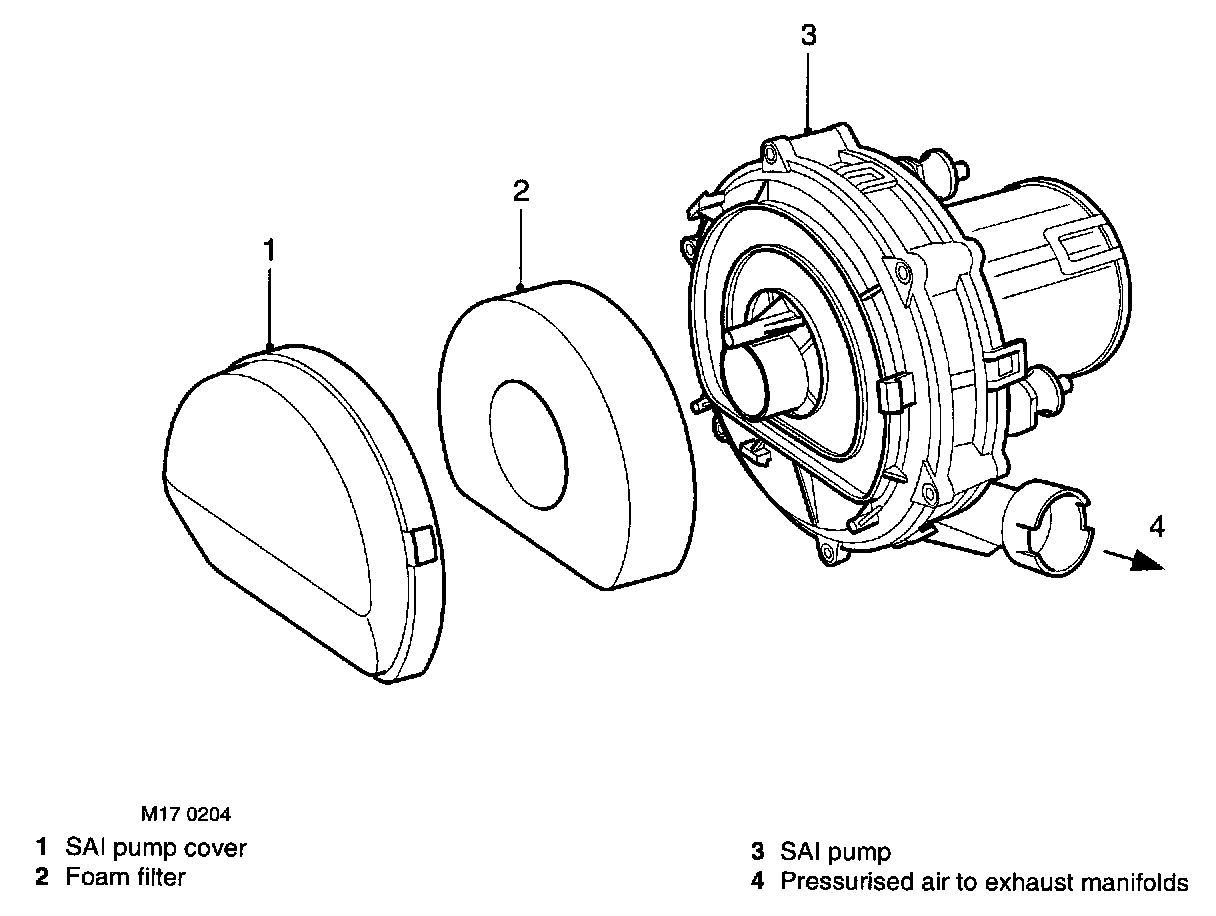 The foam filter in the air intake of the SAI pump provides noise reduction and protects the pump from damage due to particulate contamination. In addition, the pump is fitted on rubber mountings to help prevent noise which is generated by pump operation from being transmitted through the vehicle body into the passenger compartment.